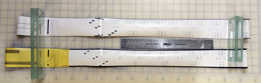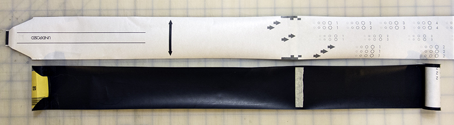Interesting stuff, backing paper. It has a lot going on. Take a minute soon to open a package of film you're willing to sacrifice. Since old, expired film from Ebay is the easiest way for most people to get spools and backing paper in a hurry, you're likely to get the opportunity without wasting good film. Notice where the film is attached. Carefully remove it, but leave behind the piece of tape on the paper. If the tape is old and crusty, carefully remove it and mark the place. If you tear the backing paper, you can mend it with transparent tape on the white paper side of the roll.