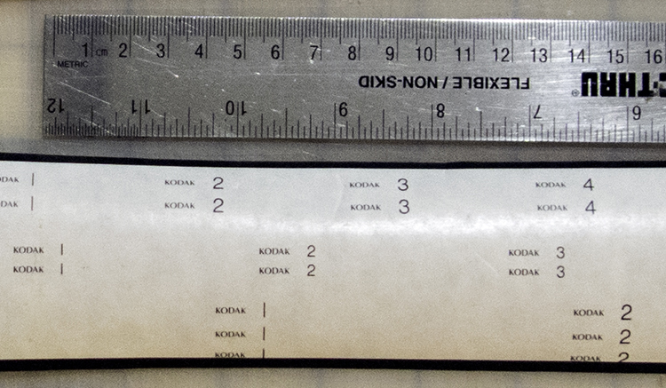 You can see that there are three lines of numbers in different spacings. Since this is 120 film, the top line is for cameras that expose 6x4.5 cm frames. The middle is 6x6, and the bottom is 6x9. The ruby window on any particular camera is located on the camera back so that the appropriate line of numbers shows through. With Kodak film, you can tell a new exposure number is coming up when you see the word "Kodak." Ilford film has four rows of circles that increase in size as you come up on the number. If you get in the habit of precisely centering the exposure numbers, you'll end up with even rebates, the clear space around each exposure.