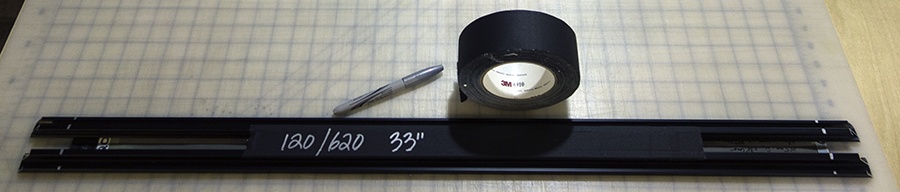 Last step is to cover the foamcore board with a piece of gaffer tape (or duct tape, but I like 3M gaffer tape for a lot of tasks, including film holder repair, so I always have a roll). Mark the frame pieces on both ends of the film strip. If you are cutting more than one format—either because you have the cameras, or in order to maximize your cuttings—the silver marks make it much easier to determine under safelight whether or not you've got a long enough coating of emulsion.
