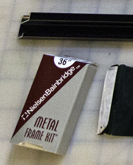 The above picture represents a couple of steps. First, lay down strips of double-sided adhesive tape along the long edges on both sides of the film on the emulsion side. Carefully line up one of the Nielsen frame pieces right along one edge of the film. Press hard to make contact with the tape. Next, place the second frame piece one sixteenth of an inch/2 mm in from the second edge. Press to make contact. Now, cut strips of foamcore board to precisely, yet snuggly, fit between the frame pieces. It takes a stack of three, and each will be a little different in width. These keep the frame pieces separated and form a nice, sturdy assembly. Now, take a sharp utility knife and cut off the overhanging sixteenth-inch film selvage. You have made the cutting guide a little narrower than the film format because you'll pick up that width again when you cut your film.